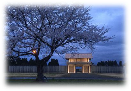4月中旬の観桜会は、払田柵跡の外柵南門が昨年度改修工事を終えたことから、南門と桜をライトアップしました。