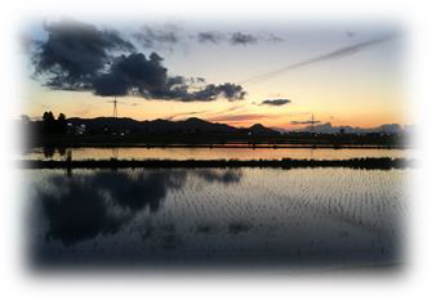 田植え後の5月下旬、水が張られた田んぼです。遠くに西山、大平山(姫神山)が見えます。何気ない日常の中にこんなにきれいな風景が見られるのは、幸せなことですね。