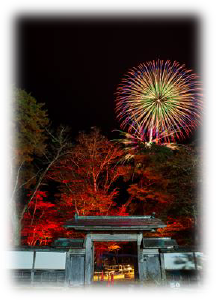 ライトアップは平成25年から続いていますが、初めて花火が打ち上げられ、紅葉と花火のコラボにしばし会場全体が目を奪われました。