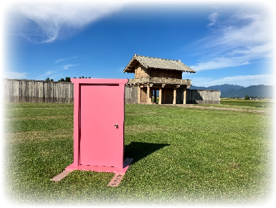 昨年度から払田柵跡に「どごさでもドア」がイベント時に度々現れるようになりました。晴れた日には払田柵南門と芝生の緑と空の青、そして「どごさでもドア」の鮮やかなピンクが映え、ちょっとした映えスポットになっています。皆さんも帰郷した際には、どごさでもドアを探してみてください。タイミングが合えば、ピンクのドアに出会えるかも。