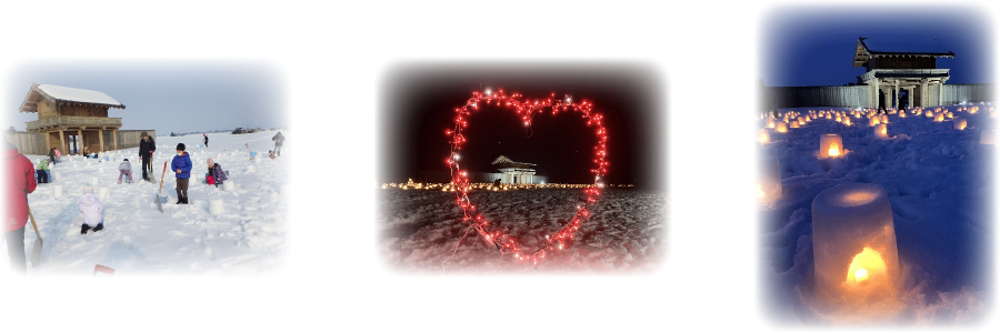 夕方頃から払田柵南門がライトアップされ、蝦夷ほたるにロウソクの火が灯されると、払田柵跡は幻想的な光の世界に包まれました。今年はちょうど冬まつりの日がバレンタインデーと重なったこともあり、ハート形の光のオブジェも登場し、訪れた方は思い思いに幻想的な光景を楽しんでいました。