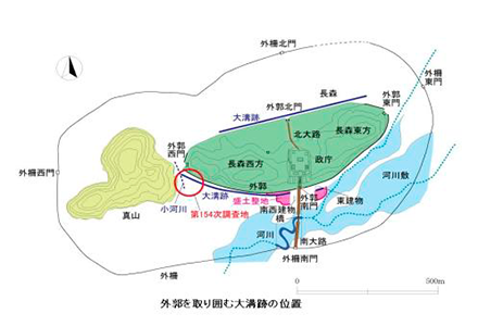国指定史跡「払田柵跡」で、政庁があった長森丘陵の外周のほぼ全体に大きな溝(大溝)跡があることが確認されました。県教育長払田柵跡調査事務所が1990年代から断続的に行ってきた発掘調査で判明しました。大溝の役割については、朝廷の威光を蝦夷らに示そうとした可能性も考えられるとしています。