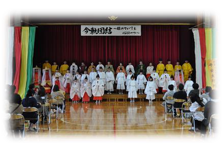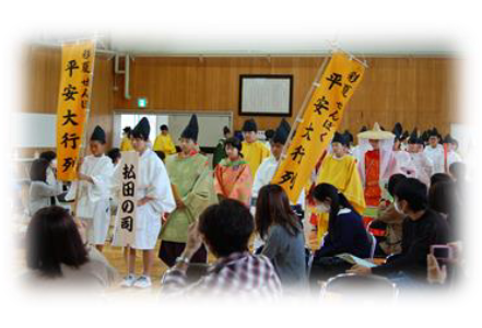 今年は彩夏せんぼくが中止となり、例年、仙北中学校1年生が行っている平安行列もできませんでした。そこで、「史跡の里実行委員会」で北中祭での平安行列を提案したところ、中学校でも快諾していただき、総合の時間に「払田柵跡」の学習を行い、その総まとめとして平安行列を行いました。古代衣装に身を包んだ子どもたちは、少し緊張した面持ちでおごそかな雰囲気の中、太鼓の音に合わせてゆっくりと歩を進め、最後はステージ上で並んで口上を述べました。とても立派な子どもたちの姿でした。