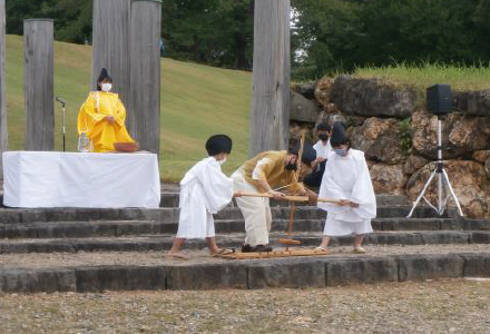 8月24日開幕の東京パラリンピックの聖火の採火式が、8月16日に払田柵跡政庁前で行われました。高梨小、横堀小、仙北中の代表の子どもたちが、平安衣装に身を包み、「舞錐(まいぎり)式火起こし」で採火を行いました。「舞錐式火起こし」というのは、こすり合わせた木の摩擦熱で火をおこす方法で、縄文時代に行われていたとされています。火起こしは重労働に見えますが、意外と軽く、力はそれほど必要ないそうです。